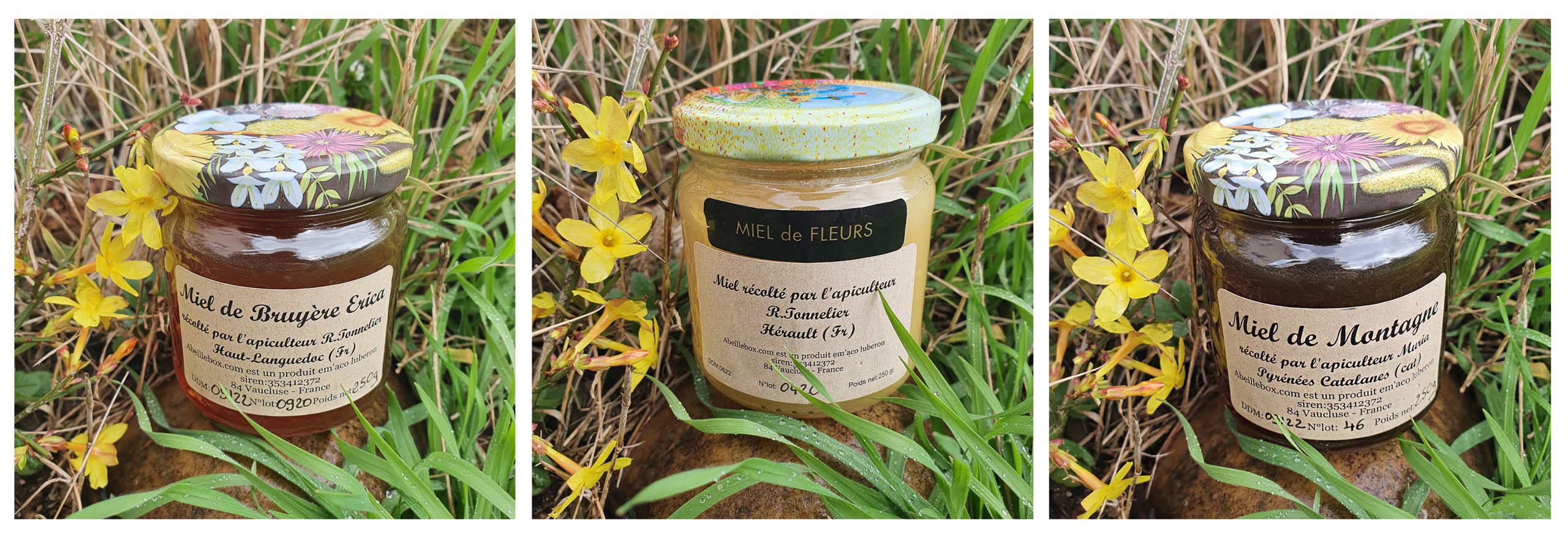C’est donc très rapidement, que j’ai reçu une box bien garnie. À l’intérieur, on retrouve une petite fiche descriptive, ainsi que trois variétés de miels de teintes et de goûts différents. De quoi offrir une belle découverte.
