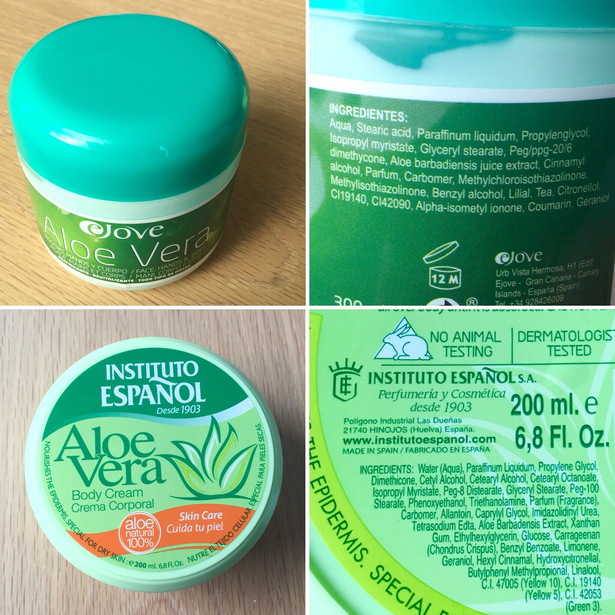 Ce qui est aussi important d’observer, c’est l’ordre d’arrivée des composants dans cette liste (Aussi appelée, dans le jargon, liste INCI : International Nomenclature of Cosmetics Ingrédients). Ainsi, les substances arrivent toujours par ordre de concentration. Dans notre cas, l’Aloe Vera intervient toujours en tête. Ce qui en dit long lorsque l’on compare avec d’autres produits vendus sur le marché. Je pense notamment à mon acquisition, lors d’un voyage aux Canaries, de deux pots de crème revendiquant clairement une composition faite d’Aloe Vea. Si les Canaries sont réputés pour leur production en la matière, et que l’hydratation, à l’usage de ces crèmes, était au rendez-vous, la composition en revanche m’a véritablement laisser sans voix. Observons un bref comparatif :