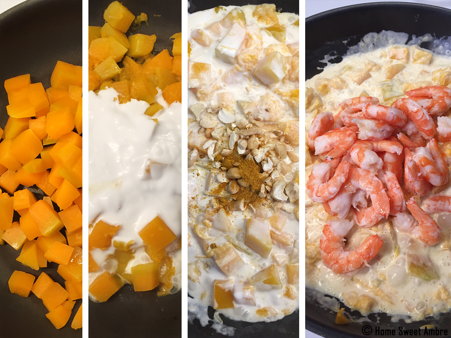 Voici une petite recette de cari née de mes expériences culinaires. Ce que j’appelle « mes improvisations ». C’est-à-dire, lorsque les choses improbables qu’ils me restent dans le réfrigérateur m’obligent à être inventive. Et l’on débouche parfois sur d’heureuses surprises. Comme ce plat, qui a tout à fait été adopté ! Pour le coup, je ne sais pas trop comment le nommer. Il s’agit d’une sorte de cari de crevettes que l’on peut réaliser avec de la citrouille ou du butternut. Et ça tombe plutôt bien puisque c’est de saison ;).