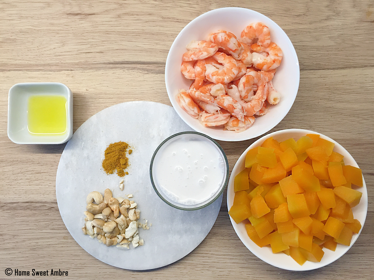 1 – Coupez votre citrouille ou votre butternut en dès – préparer vos crevettes.
