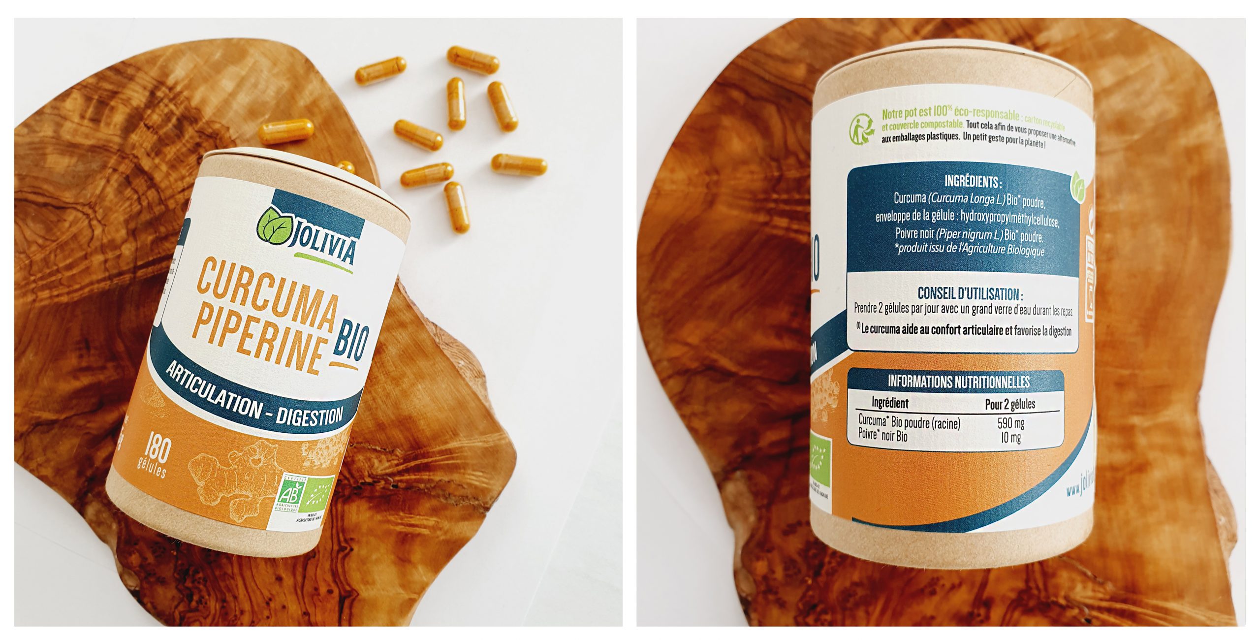 Je prends donc les gélules de curcuma et pipérine bio AB, de la marque Jolivia. Elles sont fabriquées en France.