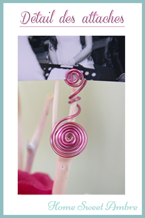 - Attaches les petites spirales que tu auras réalisé avec le fil d’aluminium rose et qui te permettront de pincer tes photos et les maintenir ainsi sur la composition.