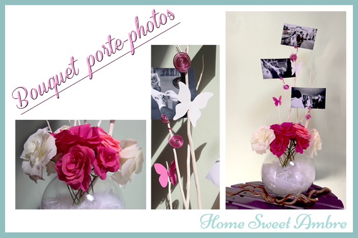 Si j’ai tapé dans le mille sur la recherche de tes envies ou besoins, tant mieux! Sinon pour les curieux et curieuses voici le « Bouquet-porte-photos-mariage ». Bon OK, j’étais à court d’idées pour le titre, mais c’est évidement parce que j’avais « tout donner » pour l’objet ^^(si tu as des idées de titre accrocheur, ou pas, je suis preneuse ;). C’est une idée qui m’est venue avec les quelques petites bricoles qui trainaient chez moi. Cette composition pourra aussi bien servir de décoration pour les filles « toutes douces » ou pour les mariages dans une version décoration et plan de table.