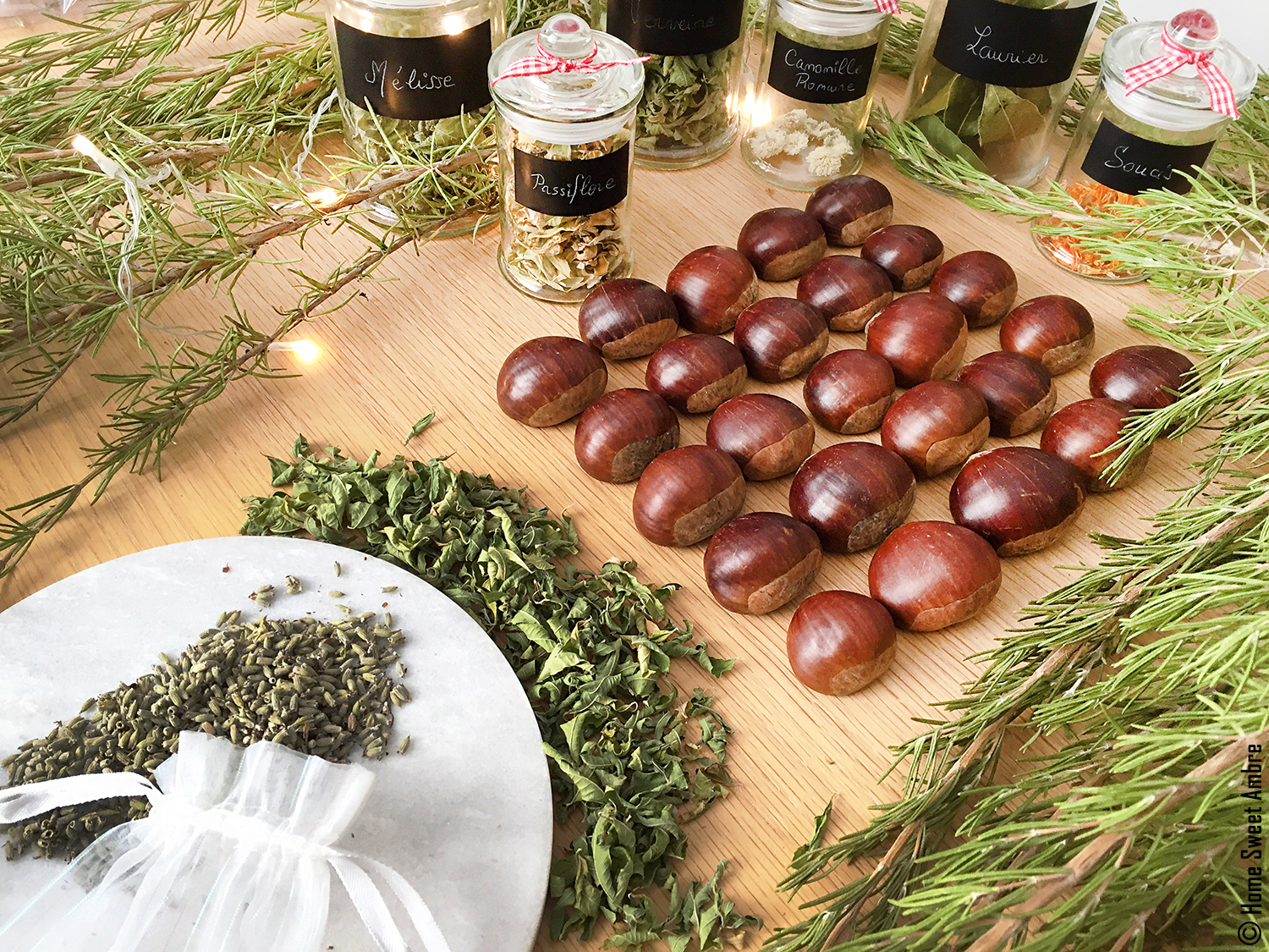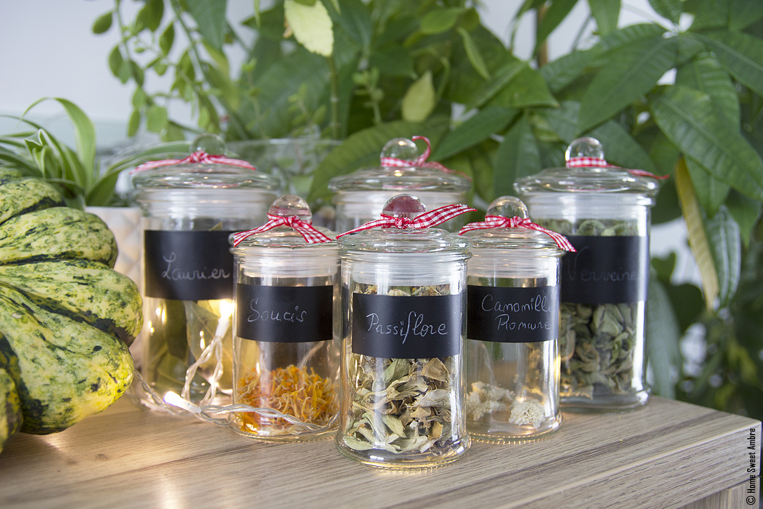 Je fais sécher mes dernières plantes (menthe, verveine, mélisse, thym, laurier, romarin…), en vue de me préparer tout l’hiver durant de savoureuses et réconfortantes tisanes. Aussi, je prends soin de les disposer dans de jolis bocaux.