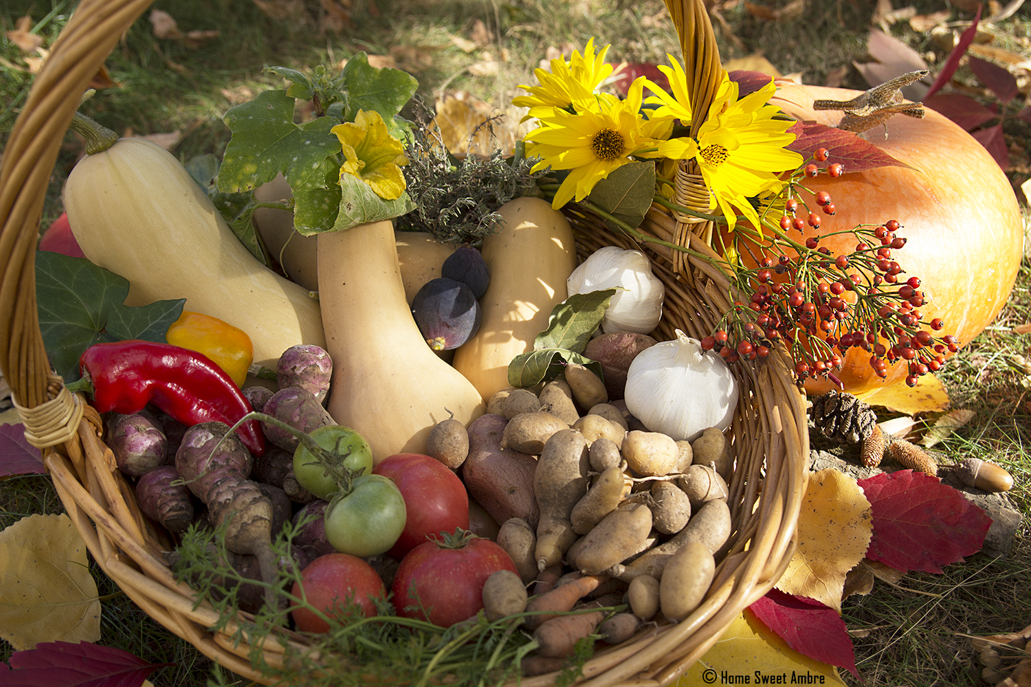 C’est également, le temps des dernières récoltes côté potager : citrouilles et butternuts, figues, poivrons, piments, topinambours et rattes, mais aussi tomates vertes ou rouges, entre autres choses. Les derniers coulis, chutney de tomates vertes ou de pommes sauvages, viendront ensoleiller les repas des mois les plus froids.