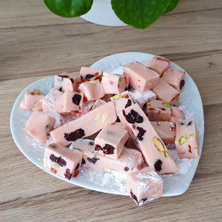 Aujourd’hui, je vous partage l’une de mes recettes personnelles : les bonbons roses. Initialement, j’étais partie sur une recette de nougat, mais vous me connaissez, j’ai tendance à suivre mon inspiration et au final n’en faire qu’à ma tête. Résultat, je me suis retrouvée avec tout autre chose, que ce soit en terme de goût ou texture. C’est un peu l’histoire d’une recette ratée qui, contre toute attente, se serait avérée être une très belle surprise. Cela vous rappel quelque chose ? La tarte tatin. C’est rudement bon et pourtant…Alors, je n’ai pas la prétention d’en être là, mais vous avez compris l’idée. Je vous en dis plus tout de suite et vous retrouverez à la fin la recette filmée.
