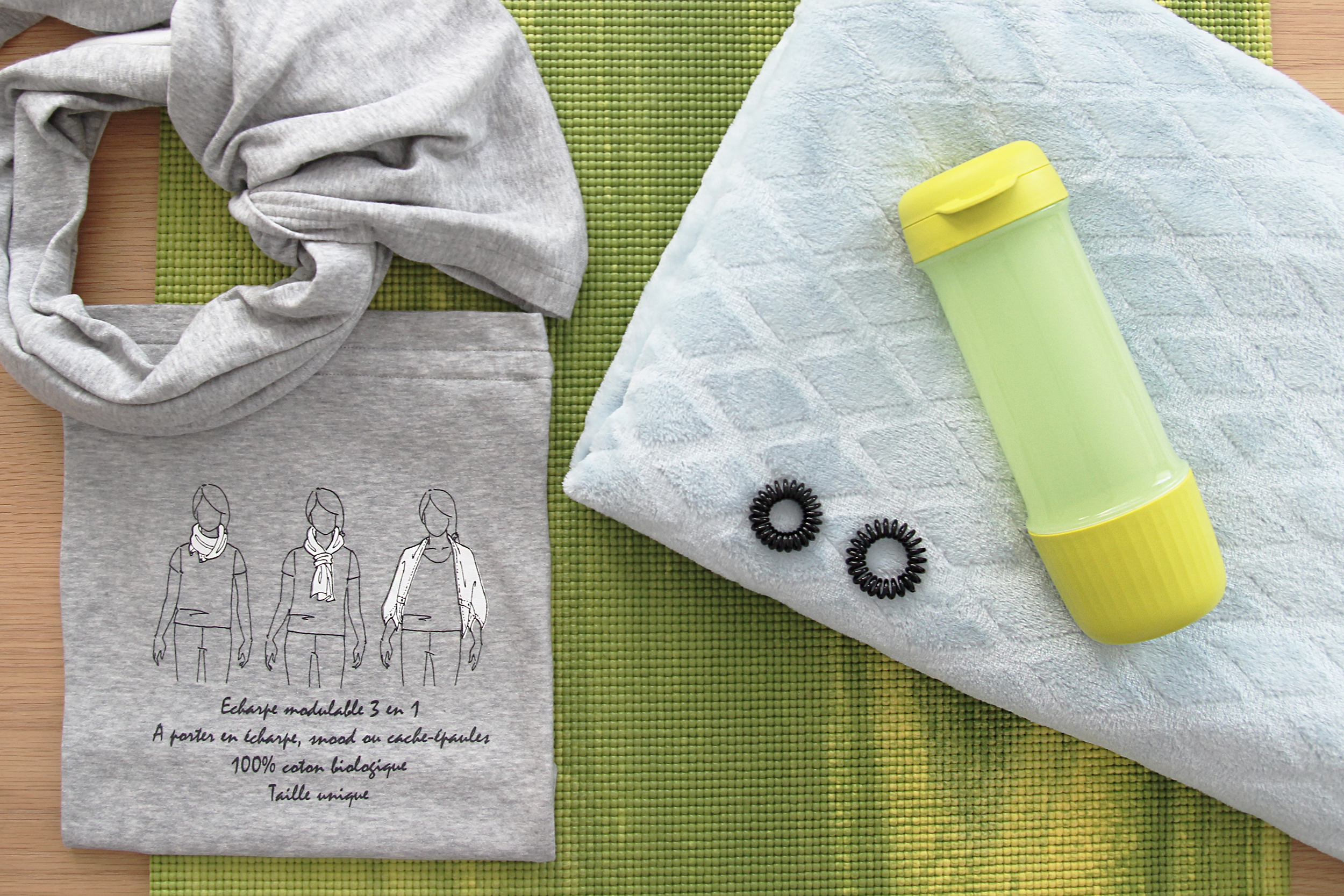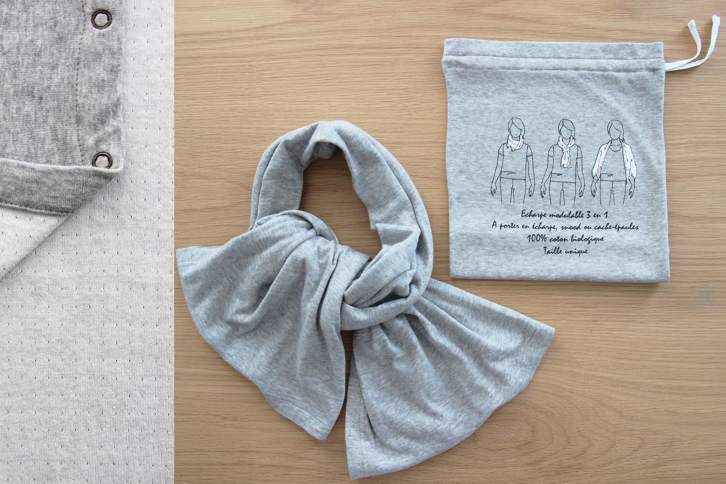J’ai d’ailleurs récemment trouvé, sur le site de Nature et Découvertes, une écharpe modulable 3 en 1 (je suis dingue des trucs modulables et j’en fabrique moi aussi). Qui permet aussi de couvrir les épaules. Elle est très pratique et je l’utilise dans tous mes déplacements notamment en avion où elle est devenue indispensable. On peut également la mettre en cache-cou, en écharpe ou mini-plaid. Elle a une composition 100% coton bio et est très douce. Seul bémol, elle se froisse rapidement. Je l’ai choisi en gris chiné, mais sachez qu’elle existe en teinte corail. Enfin, il en va de 16€95 et elle est garantie 2 ans.