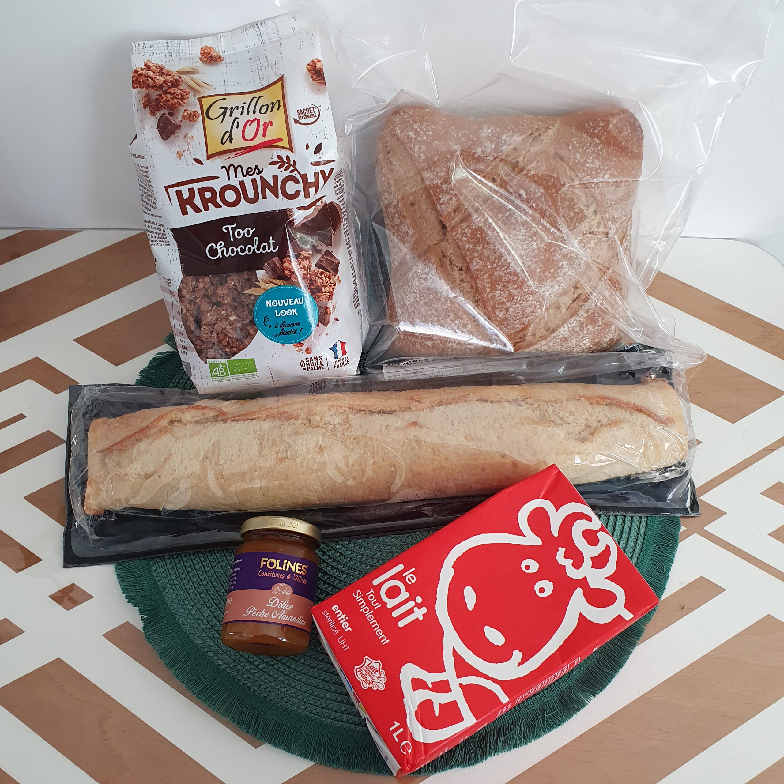 Le lendemain matin, j’étais face à ma plus grande envie, mais aussi ma plus grande déception. Lorsque j’ai sélectionné le petit-déjeuner en 10 portions, il était écrit « du pain, des céréales ou muesli, de la compote ou un produit laitier, et un petit plaisir sucré ». Certes, le petit pot de confiture et le Muesli au chocolat étaient bien sympas, le lait restait cohérent pour aller avec le Muesli, mais un pain et une baguette ? Ça fait beaucoup de pain quand même ? On mange des céréales ou du pain, les deux en même temps ce n’est pas franchement équilibré ni plaisant. À côté des photos enthousiasmantes que j’ai vu passer sur Internet, mon panier petit-déjeuner ne m’a pas beaucoup inspiré. Du coup, j’ai beaucoup regretté le plateau de fromage… Mais, à côté de ça, je reconnais que tous les ingrédients choisis étaient vraiment bons.