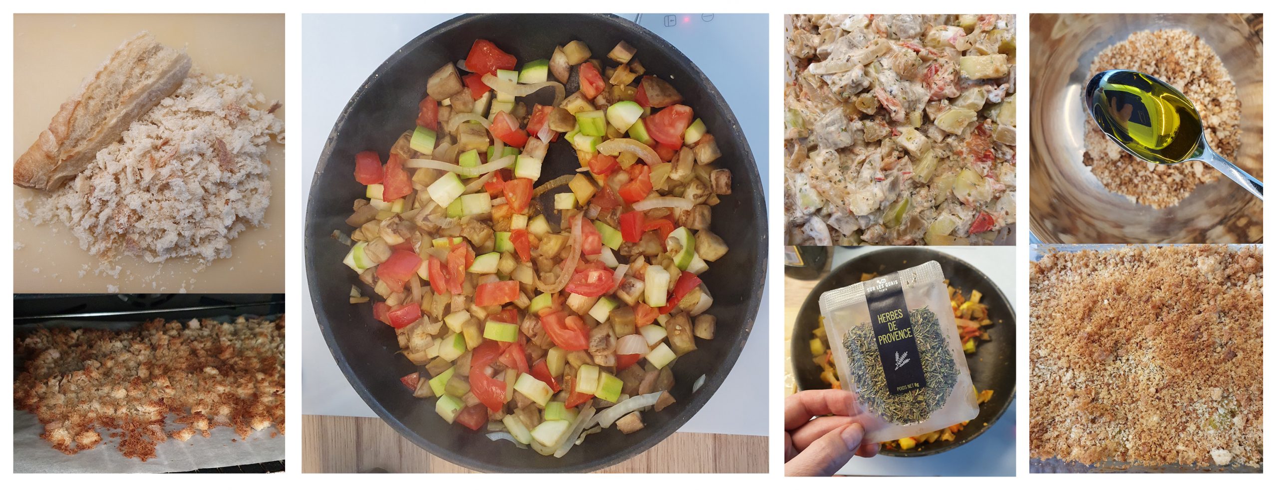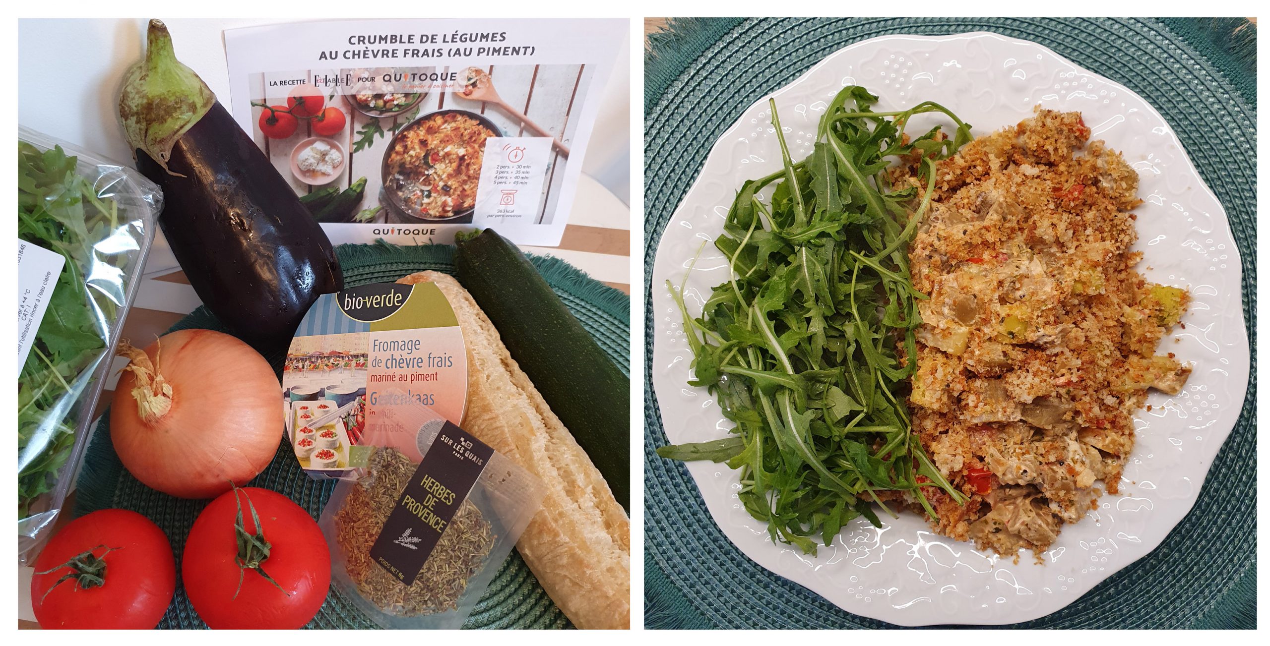 D’un côté, on émiette le pain frais et on le passe au grille et de l’autre on va laver et couper les légumes puis les mettre dans la sauteuse selon un certain ordre ( filet d’huile d’olive, oignon jaune, puis aubergine, courgette et enfin tomates). Enfin, on ajoute aux légumes l’herbe de Provence, puis le chèvre pimenté. On mélange une cuillère d’huile d’olive à notre chapelure. Puis les légumes sont placés dans un plat allant au four et saupoudré de chapelure. Après quelques minutes au four, il n’y a plus qu’à dresser les assiettes avec un peu de roquette.