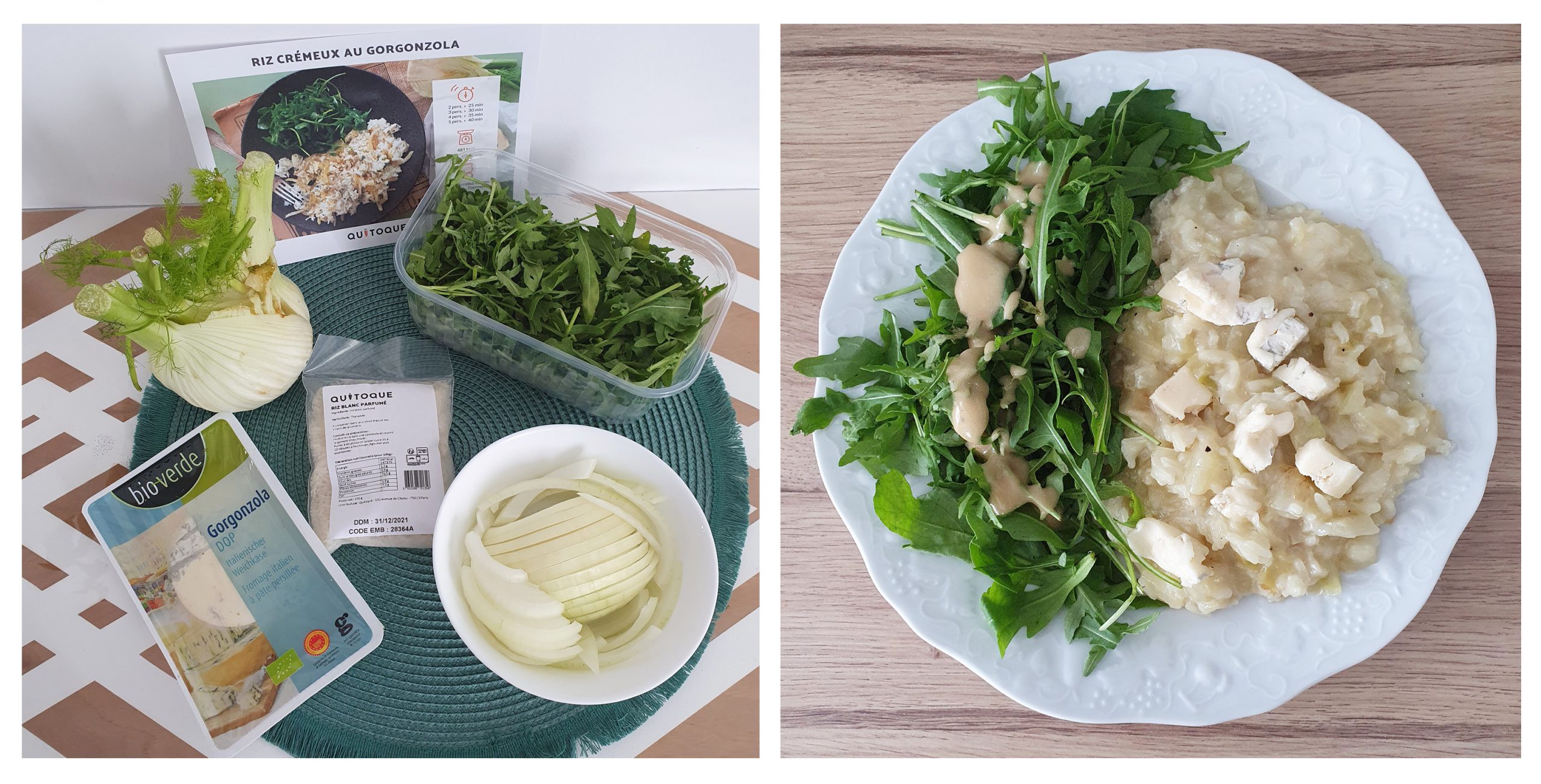 Elle fait partie des recettes « Elle à table » (magazine) réalisée pour Quitoque. Je vous disais plus haut que vous receviez la juste quantité d’ingrédient. Et c’est vrai ! L’oignon jaune était à partager avec la recette du lendemain, tout comme la roquette. C’est un hasard, mais j’avais pris des recettes qui avaient des ingrédients croisés.