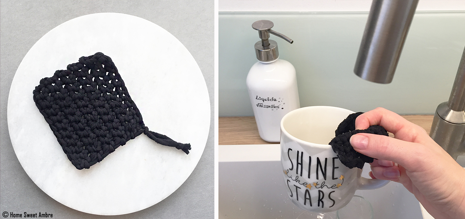 • La texture d’un collant, opaque ou non, se prêtent bien à la réalisation d’un tawashi, pour laver des tasses par exemple. Car la matière se rince facilement et sèche vite si l’on prend la peine de bien l’essorer et de suspendre notre petite lavette.