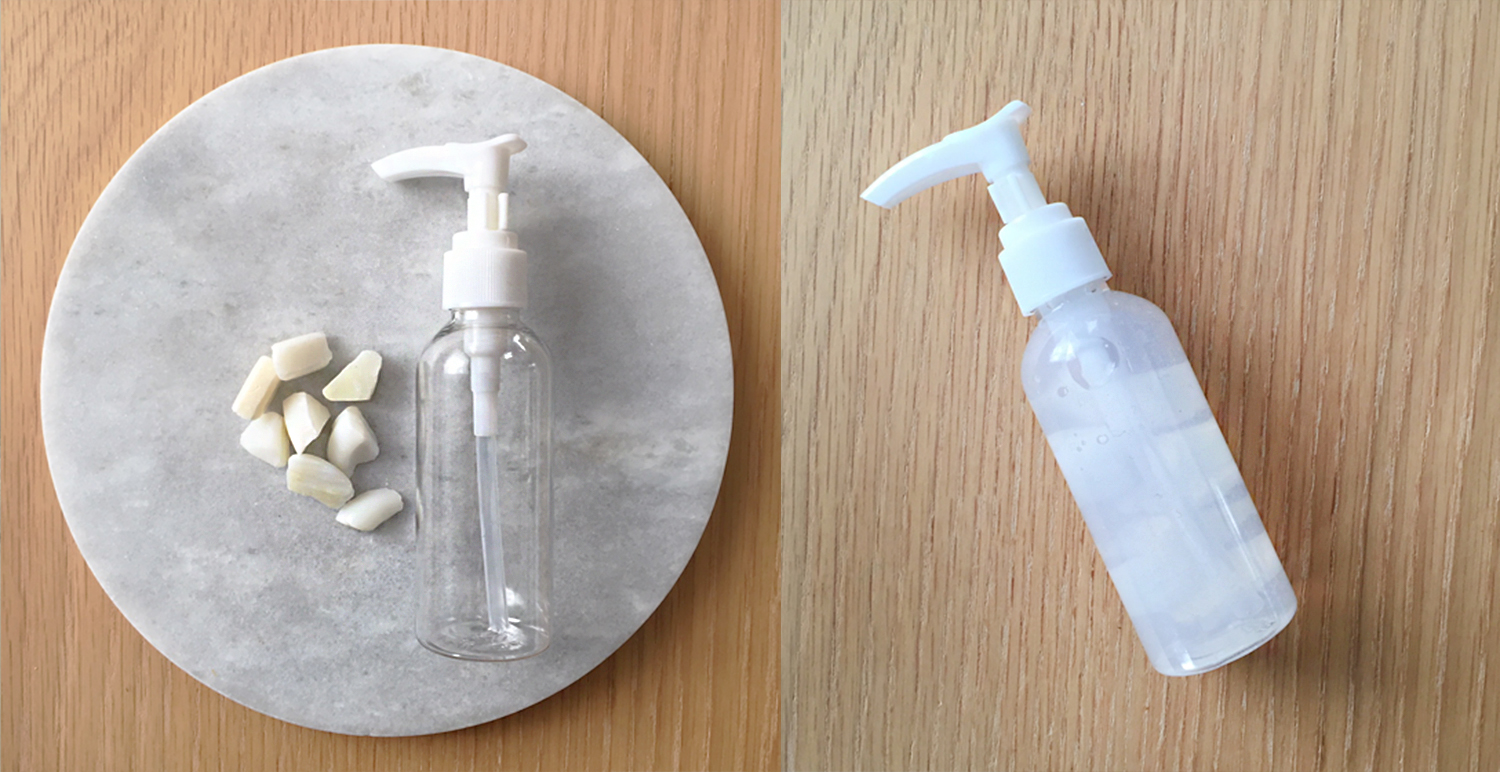 Mettre les petits bouts de savons dans un flacon d’eau afin d’en faire du savon liquide.