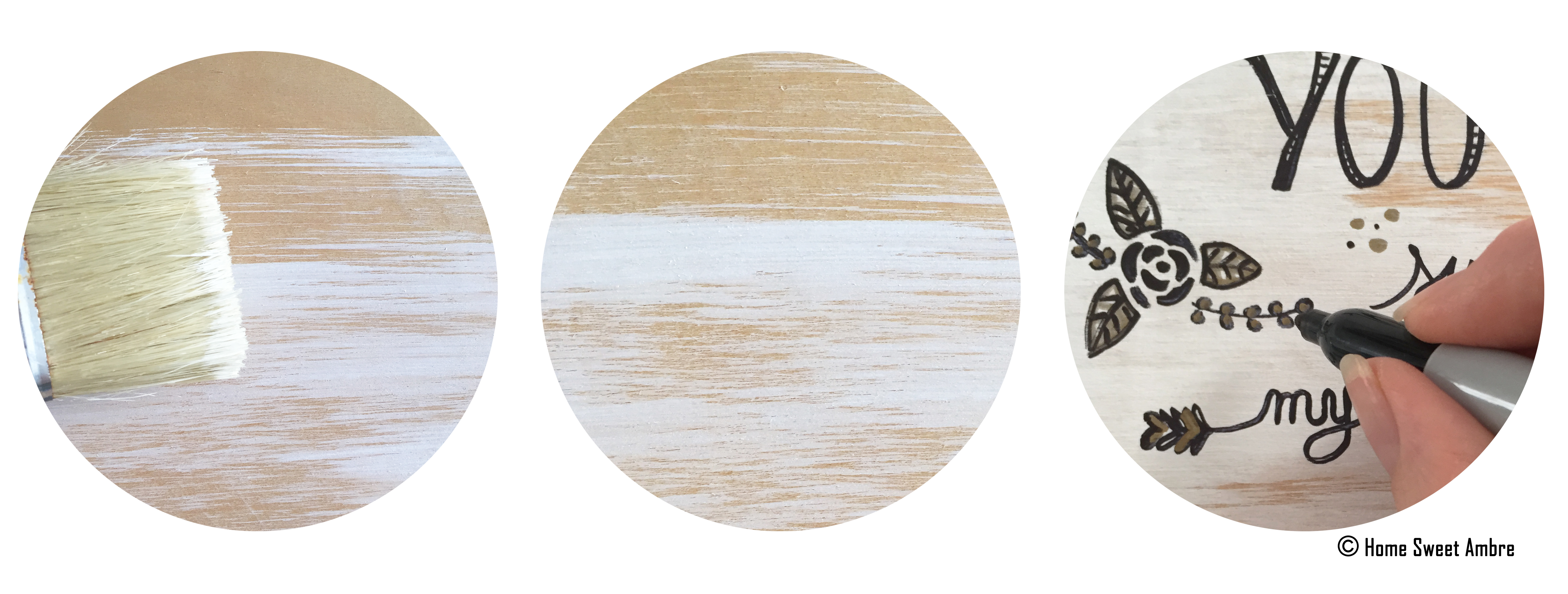 Et finalement, ça m’a pris d’un coup, je savais enfin quoi faire, il suffisait juste de me lancer. Je l’ai d’abord peinte grossièrement avec de la peinture acrylique blanche à l’aide d’un gros pinceau, de manière à laisser par endroits son bois apparent et rendre visibles les coups de pinceau. L’application était facile, et la peinture rapidement sèche car elle était vite absorbée par le bois brut. Enfin, c’est freestyle que j’ai usé de mes « Sharpie » noir et or (marqueurs permanents), pour me lancer sans base sur l’écriture d’une citation, extraite d’une chanson de la grande Aretha Franklin :