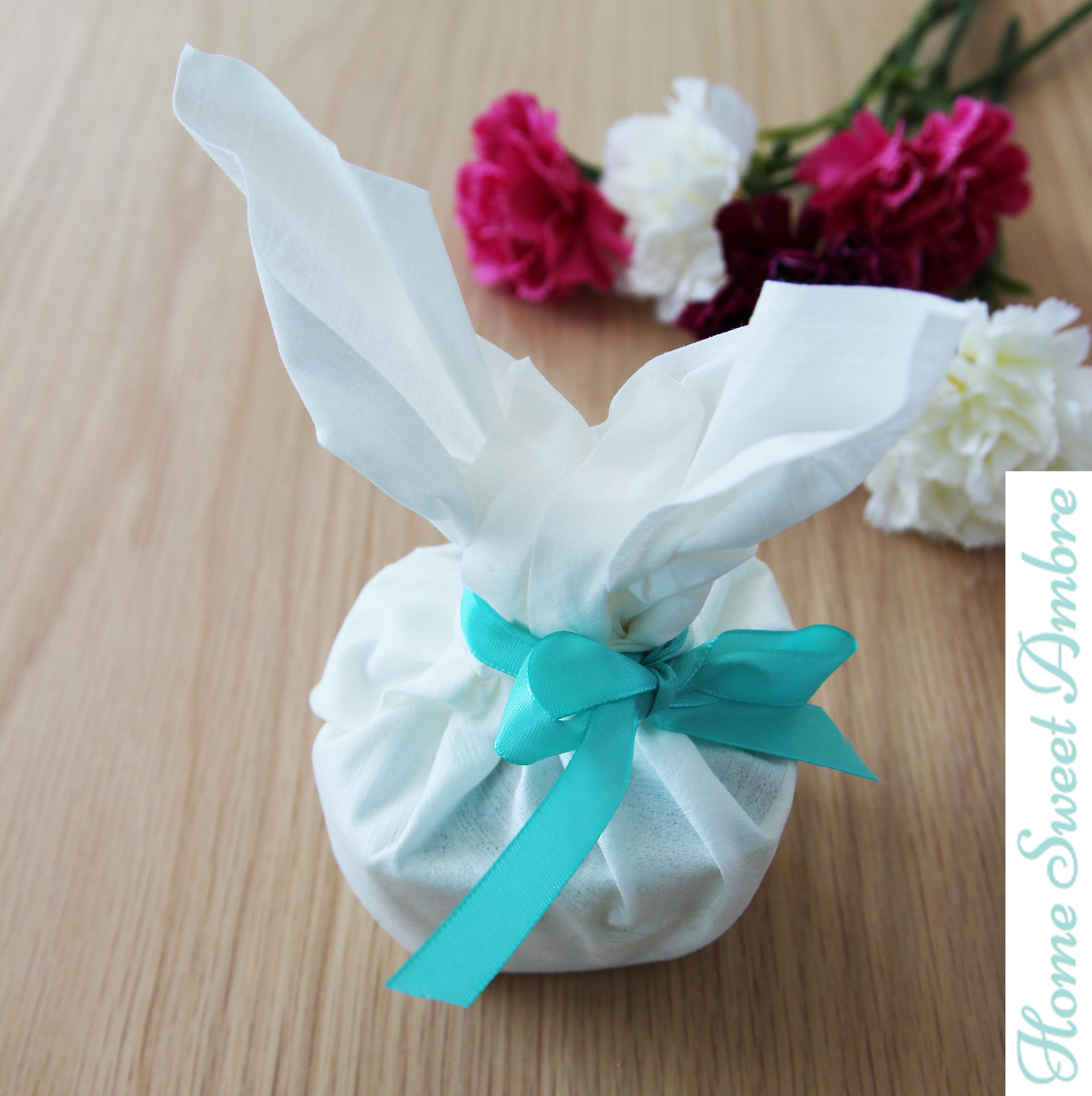 Pour ce lapin, un peu plus flou, tu peux prendre une grande serviette en intissé, en tissu ou un foulard (ce qui fait un double cadeau ^^). Ta serviette sera plus ou moins grande selon la taille de ton présent, mais toujours carré. Pour ton petit cadeau, mieux vaut le conditionner dans une forme carré ou rectangulaire, car cela facilitera le pliage. Et pour finir, un joli ruban bleu ;)…ou de la couleur de ton choix. Moi je suis dans ma « période bleu turquoise » en ce moment 🙂 (Envie de vacances probablement et d’eau paradisiaque lol).