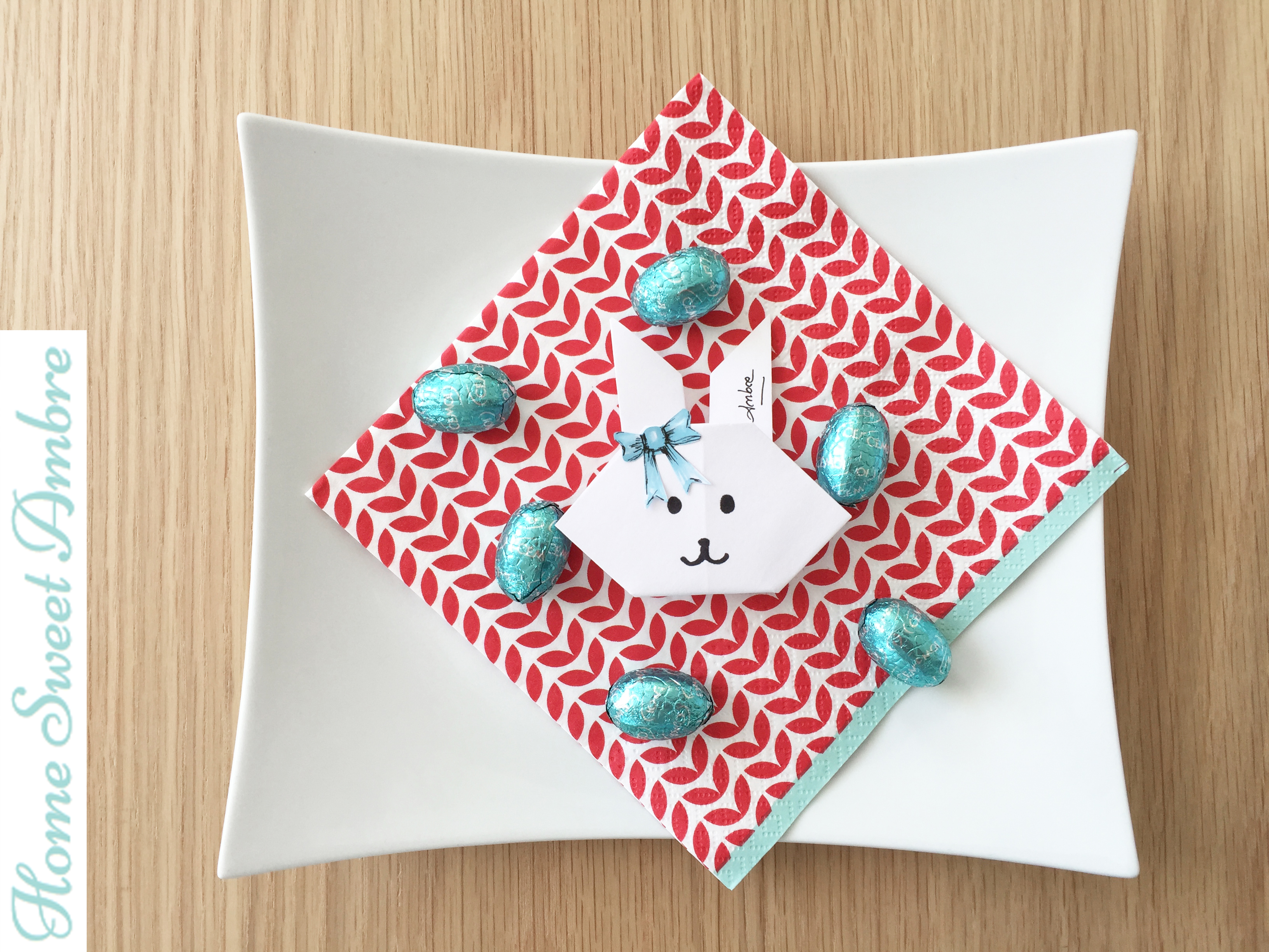 Le petit lapin ci-dessous est à réaliser en papier. Pars d’un carré plus ou moins grand, selon la place que tu veux faire occuper à ton lapin dans l’assiette, et le tour est joué ;). A titre d’exemple, le mien était fait à partir d’un carré de 12×12 cm et l’assiette que tu peux percevoir sur l’image est en réalité une assiette à dessert.