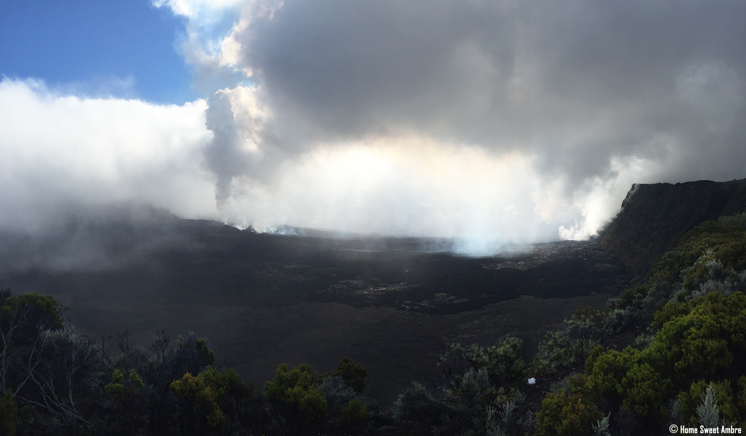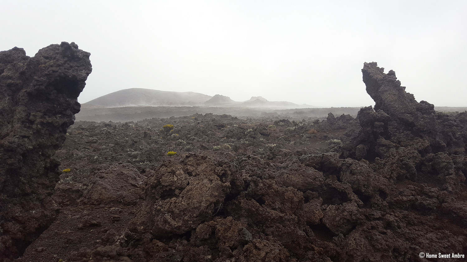 Nous n’étions pas les seuls à braver le mauvais temps. Même si, dans l’ensemble, tous faisaient demi-tour. Et pourtant, la chance nous a souri en nous offrant à la fois une petite éclaircit et une visibilité sur les fumées du volcan. Beau, redoutable, impressionnant. Nous avons passé ces moments incroyables, avec la compagnie fortuite, d’un autre couple de randonneur tout à fait adorable que je salue au passage ;).