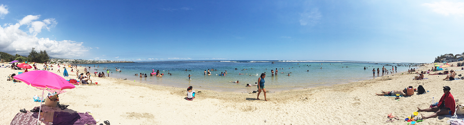 Vous savez, quand on aime, on ne compte pas ! Alors nous retournons, une fois de plus, à ce fameux lagon de l’Ermitage-les-bains. Et là, grosse surprise. En ce dimanche midi, nous observons une plage noire d’un monde venu fortement équipés de tables, chaises, barbecues, parasols, etc. L’ambiance est celle d’une multitude de pique-niques familiaux où les différentes musiques se mêlent aux rires d’enfants.
