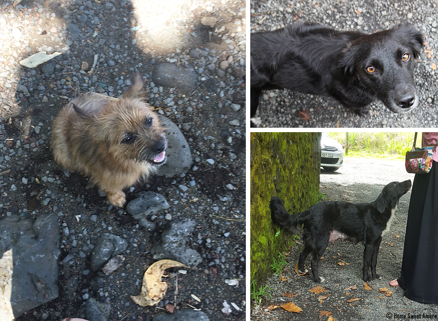 S’il y a quelque chose que j’ai véritablement détesté sur cette île et qui a jeté un froid glacial sur mon séjour, ce sont nos nombreuses rencontres avec des animaux abandonnés. Au début, on pense à des animaux vivant à proximité et puis on finit par s’interroger. Les réponses qui nous parviennent ne sont alors pas agréables à entendre. Alors, c’est pauvres bêtes, initialement domestiquées, sont livrées à elles-mêmes. Elles se reproduisent entre elles et survivent tant bien que mal grâce à un sandwich laissé par-ci ou par-là. Elles sont toujours en quête de caresses lorsqu’elles croisent un humain. Certains randonneurs, plus avisés, viennent avec des croquettes. Nous avons vu, des chats, des chiens, des chiots. Et même une vache ! Cette dernière s’étant peut-être simplement perdue. Ces animaux recherchaient réellement la compagnie de l’homme. Un chat « totalement abîmé par la vie » est resté tout un après-midi auprès de nous. Juste là, à ronronner. Très honnêtement ça m’a rendu malade et furieuse. Je crois que je me souviendrais toute ma vie de cette petite chienne (que l’on voit en noir sur la photo). Nous l’avions vu au Bassin la Paix et aurions été près à l’adopter, mais celle-ci avait des tétines et cela impliquait qu’elle avait dû cacher ses chiots. La prendre aurait mis en péril la vie des petits…