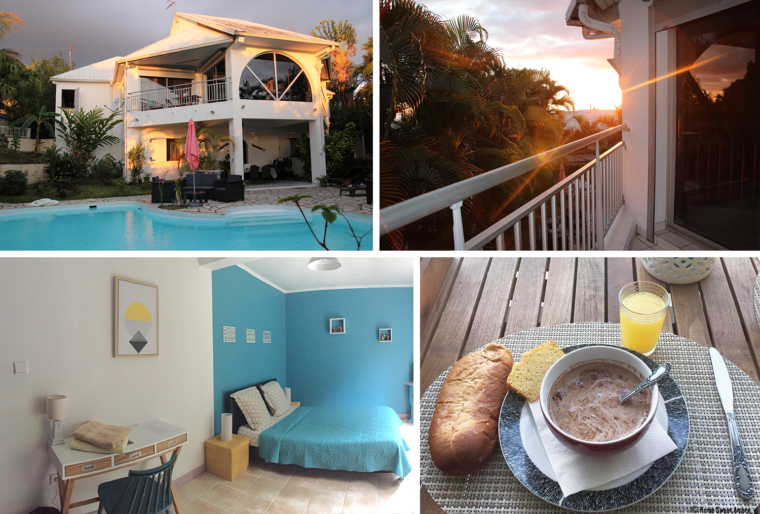 Le soir nous somme reçus par Brigitte et Laurent, dans leur superbe villa d’Hôte : Aux Deux Orangers , à Entre-Deux. Grâce à eux nous oublions l’épisode désastreux de la Plaine des Cafres et nous nous accordons un « VRAI » moment de détente dans ce havre de paix. Le confort et la décoration de notre chambre ont été savamment pensés. Le cadre de cette villa est idyllique : piscine, billard, jardin arboré, fleurs exotiques, bassin à carpes Koi et salon commun. Nos hôtes sont d’une bienveillance incroyable et leurs histoires sont palpitantes. Et, cerise sur le gâteau, le petit déjeuner était royal ! Celui-ci était fait d’orange fraîchement pressées, de brioches et de pain frais. Brigitte nous avait même préparé un succulent cake citronnée.