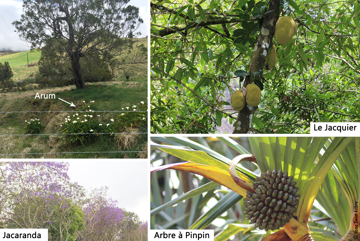 La végétation et les paysages sont surprenants ! En effet, en redescendant du volcan, en direction de Tampon, les platanes, arbres, vaches et paysages vallonnés nous faisaient penser à l’Auvergne. Seuls les arums sauvages dans les prés nous rappelaient que nous étions bien en voyage. Et sans transitions, vous vous retrouvez avec des Jacaranda qui encadrent les routes de leur belle couleur parme.
